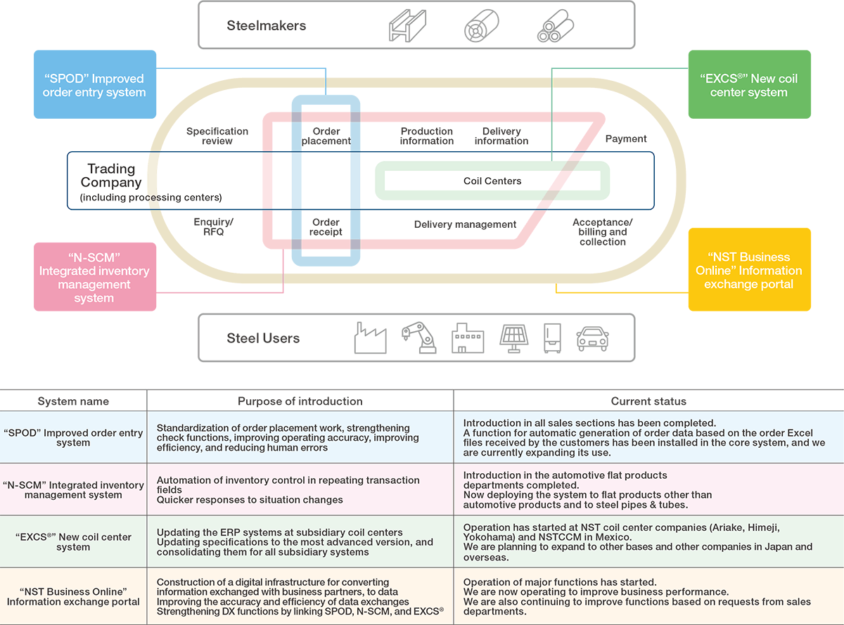 As specific measures, four systems were introduced by the first half of FY2023: improved order entry system (SPOD), integrated inventory management system (N-SCM), new coil centers system (EXCS®), and information exchange portal (NST Business Online). In the future, we will actively work to further expand their functions and deploy them at greater numbers of sites.