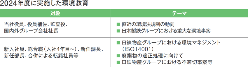 環境法規制遵守の徹底のため、社員に対して階層別に研修の機会を提供し、知識・意識の底上げを図っています。