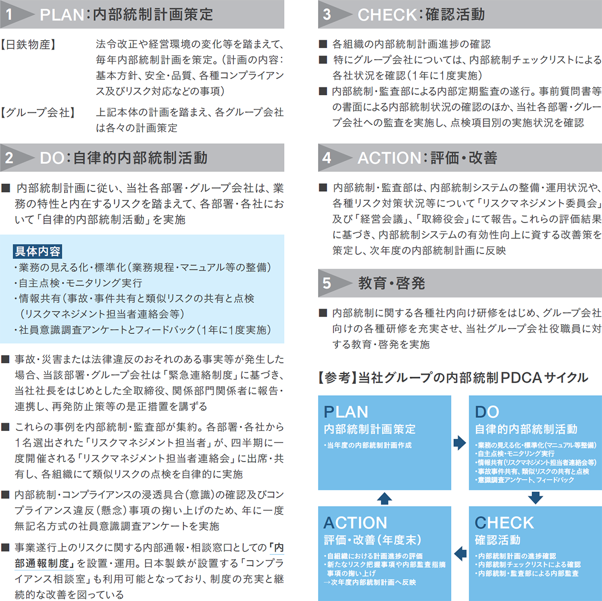 また、当社各部署及び子会社における「自律的内部統制活動」の企画・推進を担当する「リスクマネジメント担当者」を各部署・グループ会社に配置し、この体制のもと、以下の通り内部統制システムのPDCAサイクルを構築・運用しています。