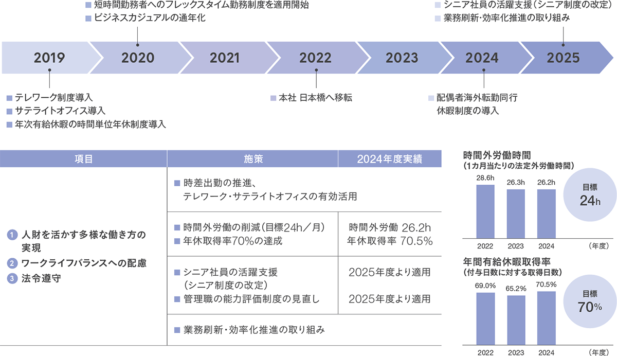 当社は、社員のワークライフバランスと労働生産性の向上を目的に、時間外労働の削減や計画的な休暇取得の奨励、時差出勤やテレワーク等、柔軟な働き方を推進する取り組みを行ってきました。業績が4期連続で過去最高益を更新する中、各種DX施策の推進等により、残業時間の削減を進め、さらに、年次有給休暇の計画的取得制度の活用・推進等により、社員の有給休暇取得意識が高まり、取得率は70%に達しています。今後も、社員一人ひとりが仕事とプライベートを両立しながら最大限の力を発揮できる労働環境を整え、さらなる企業成長につなげていきます。